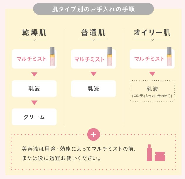 洗顔後の化粧水としてご使用いただく場合には、5〜7プッシュ程度が適量です。手に取ってゆっくりとお肌になじませてください。